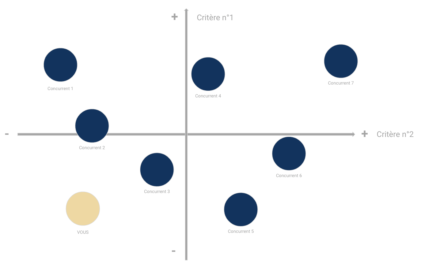 Pour résumer votre analyse, vous devez déterminer l’axe privilégié par la majorité des acteurs, pour choisir votre stratégie. Exercice pratique avec une représentation graphique du paysage concurrentiel : j’ai nommé, la carte de positionnement !